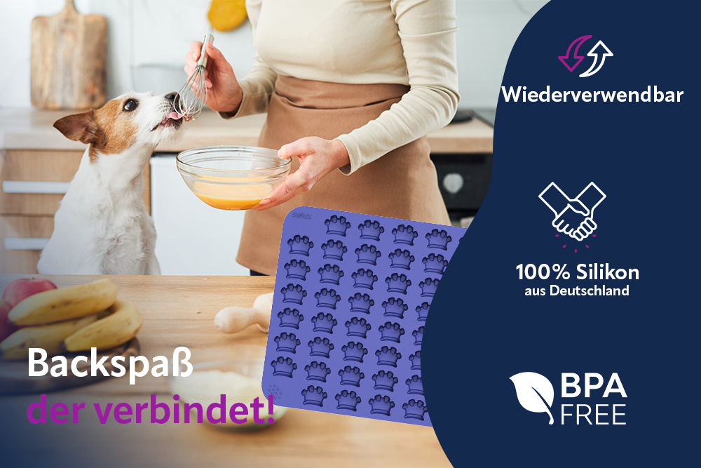 Made in Austria - Qualität, der Du vertrauen kannst. Alle unsere Produkte werden in Österreich hergestellt. Für unsere Backmatten verwenden wir hochwertiges, temperfreies Silikon aus Deutschland. Die Silikonmatten sind direkt nach dem Kauf einsatzbereit, da das verwendete Material von Grund auf frei von Weichmachern, BPA und PFAS ist - für unbedenklichen Genuss und langanhaltende Freude beim backen für deinen Vierbeiner.