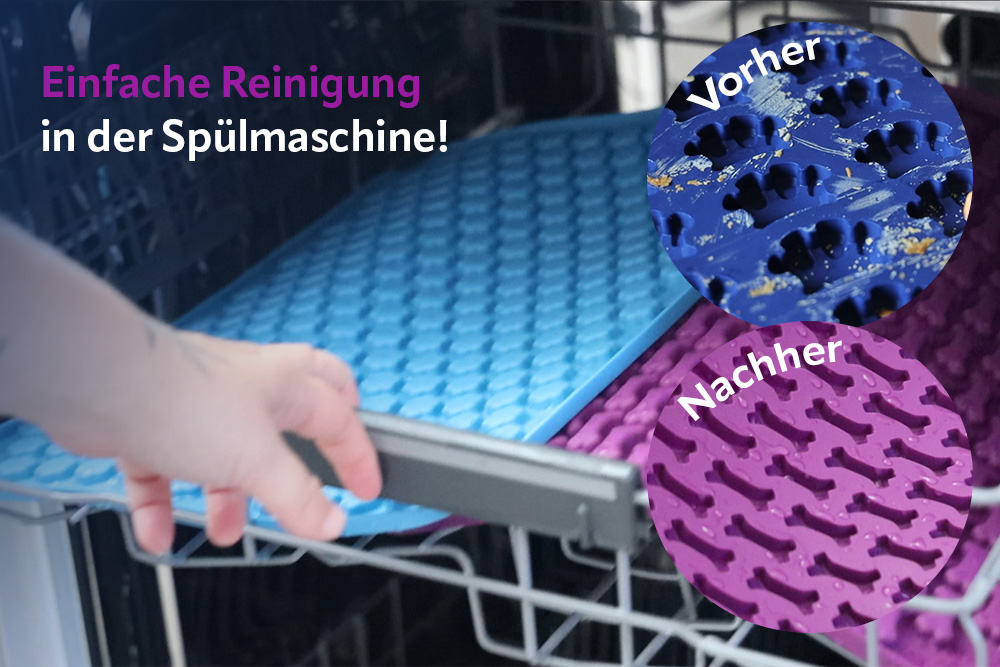 - Reinige die Matte vor dem ersten Gebrauch mit heißem Wasser und Spülmittel oder in der Spülmaschine.