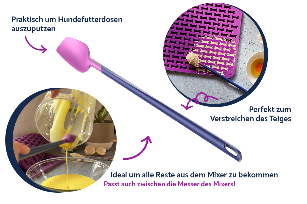 1x Backmatte Knochen lila, 1x Backmatte Krone royal, 1x Restelöffel Tenya lila-royalblau, 250 Stk. gratis Gummiringe XL